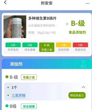 剂安安作为一款食品成分安全查询工具,能给出科学的安全等级评估与详尽解析。用户购物时,借助它可快速扫描食品添加剂及营养成分,确认各项指标数据正常后再下单,助力用户打造更安心的购物清单。