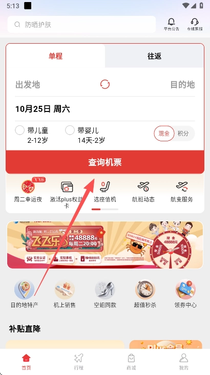 2. 当您进入首页,就能依据自身需求查询机票。