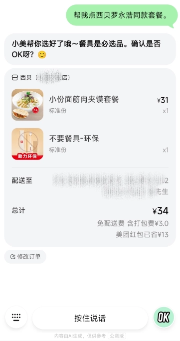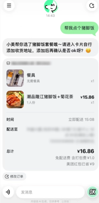 2、完成上述设置后,打开聊天界面,就能直接通过打字或语音向其分派任务,例如:帮我点西贝罗永浩同款套餐。