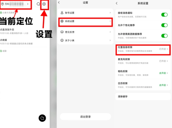 1. 小美所在页面十分简洁,进入该页面后,可点击左上角的小按钮,进而进入设置界面,在此为小美开放位置信息等相关权限。其定位信息与美团同步,并且也支持自定义设置。