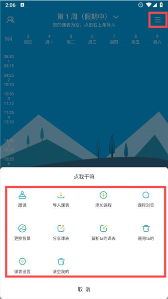 3、在课表界面点击右上角,即可进行导入课程表、蹭课、添加课程等更多操作。