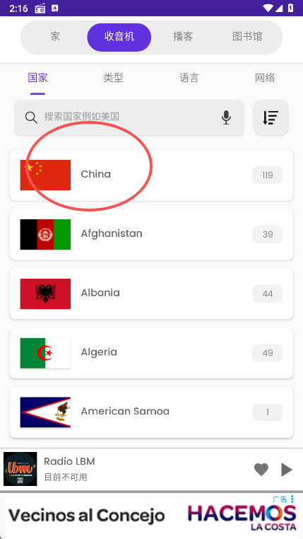 2、然后电台选择中国