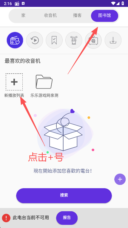 1、点击图书馆功能,选择新播放列表