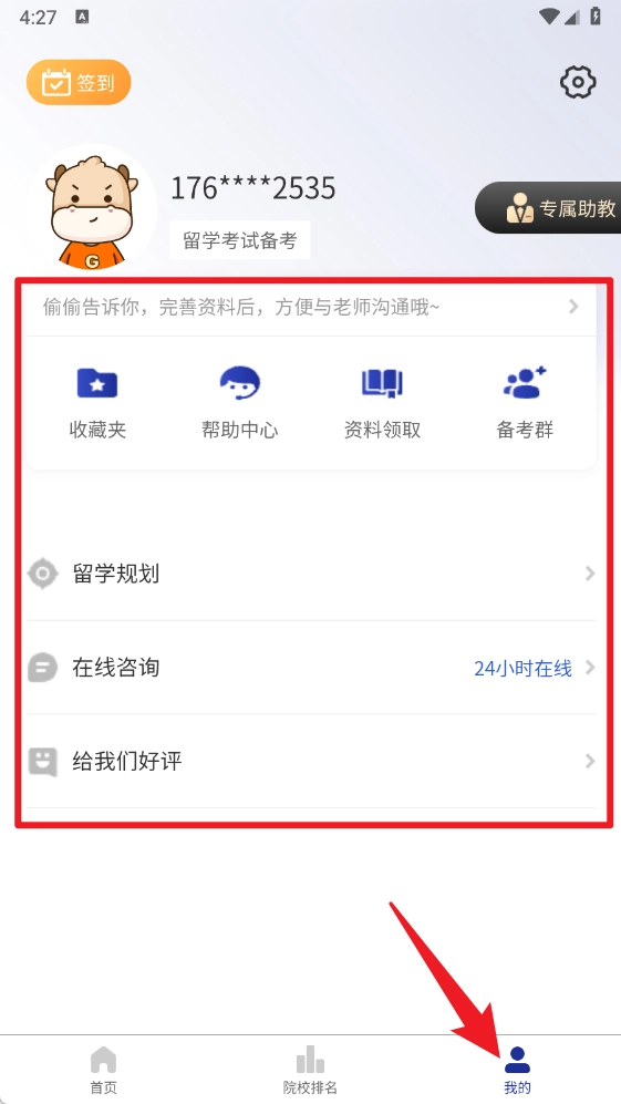 6、在“我的”页面,你能够查看收藏夹、帮助中心、资料领取入口以及备考群,同时该页面还支持留学规划与在线咨询服务。