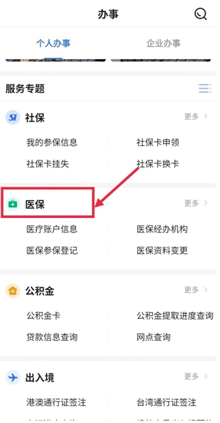 第三步:于页面中找寻“医保”业务 - “更多”,具体位置如下图所示。