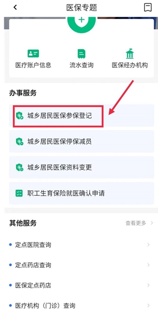 第四步:于【办事服务】页面内寻得“城乡居民医保参保登记”,具体位置参照下图。