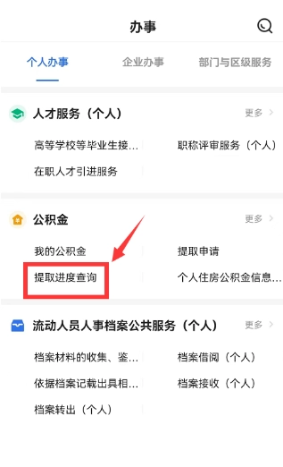 第三步:于页面里找寻“公积金”业务,点击“提取进度查询”,具体如以下图示。