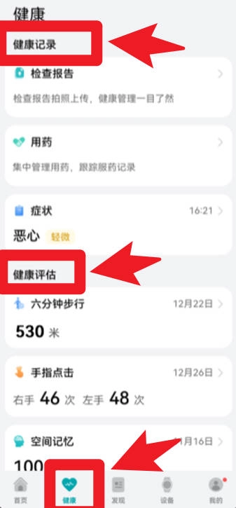 4、在健康界面可查看健康记录与健康评估,系统支持上传检查报告并记录用药信息,方便集中管理健康数据。