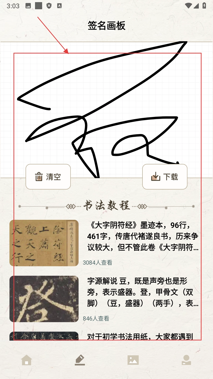 2、进入签名画板界面,可在画板【创作签名签名】,还能查看书法教程,提升书法知识。