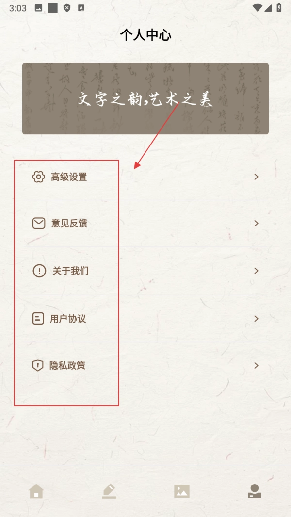 4、进入个人中心界面,可查看【高级设置、意见反馈等,了解用户协议等等】,管理应用相关设置。