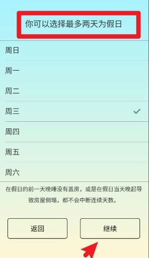 3、接着勾选每周最多两天作为休息日,休息日即使未按时睡觉或起床,也不会影响建房进度;