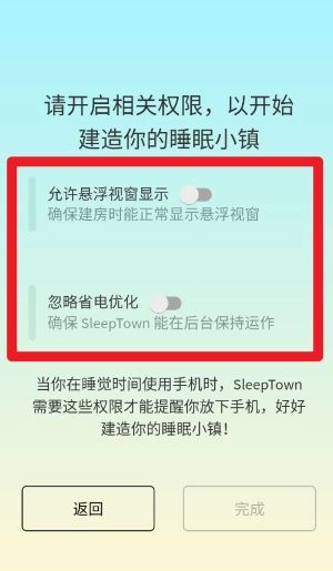 5、最后务必开启悬浮窗和忽略电池优化权限,保证 SleepTown 在后台持续运行并正常执行建房任务。
