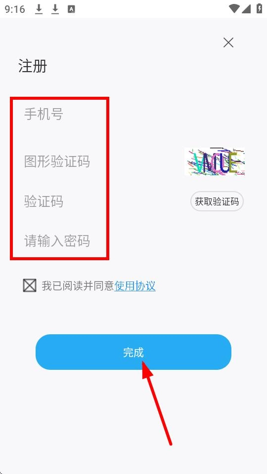 4、在注册界面,依次填写【手机号】【图形验证码】等信息,勾选协议后点击【完成】即可完成注册。