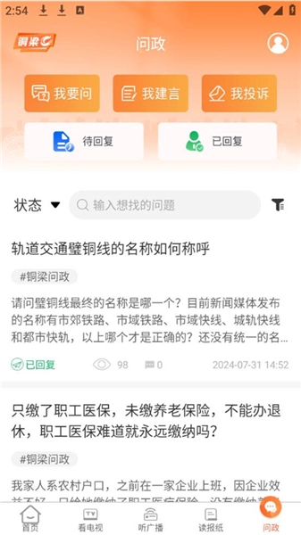 2、问政功能:人民群众能够提出问题、给出建议、进行投诉等,无论是待回复状态还是已回复情况都清晰明了。