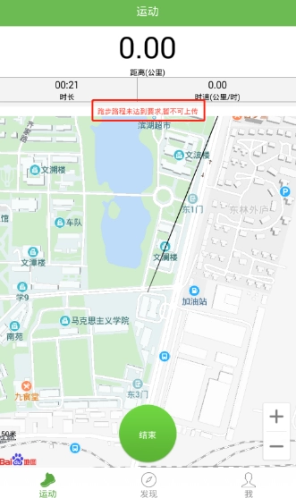 请尽量选择宽阔户外场所进行室外跑步。开始跑步之后,会画出跑步的路线,如果达到要求会提醒同学们可以上传。因为GPS定位要求,可能会显示出现定位延迟,请尽量匀速直线长跑,避免路线/速度变化过快引发的定位不准问题。因为GPS定位的要求,第一次试跑请移动距离长一点。